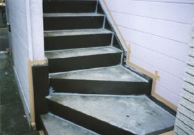 | 問題点コメント | 鉄骨階段踏面と鉄骨のスキマより雨水が浸入。 新築時に、踏面のみウレタン防水を塗布してあるが、カコミ、鉄骨部と踏面モルタルの取合いから、雨水が浸入している。 また、壁材との取合部からも漏水しているので、入隅、取合部にコーキング処理を行い、全面にウレタン防水を塗布した。 |