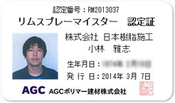 このたび第6回リムスプレーマイスター検定が実施され、5名の「リムスプレーマイスター」が誕生しました。この制度は、AGCポリマー建材(株)による自主検定制度としてスタートしたもので、超速硬化ウレタン吹付システムの施工方法から管理内容まで幅広く網羅し、技術・技能の伝承と人材の育成を目的としたマイスター資格制度に習い発足したものです。